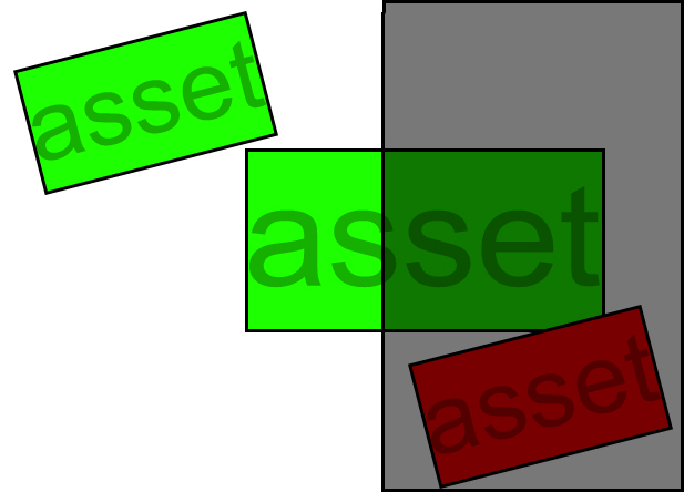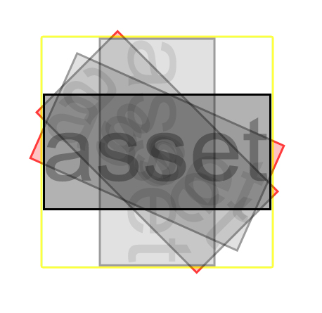 One of the simplest and fastest types of collision detection is between two axis-aligned rectangles. Therefore if we simplify the collision detection between the possibly rotated assets and the rectangle of our camera’s viewing portal into a axis-aligned rectangle-rectangle collision, then that would be ideal. So how does one simplify an arbitrarily rotated rectangle into a axis-aligned one. One solution is to bind the asset with a square having sides at least as long as the longest side of the asset.