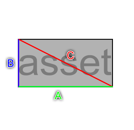 In order to solve for the hypotenuse C, we need to know the lengths of sides A and B, these are fairly simple to find, as they directly correspond to the width and height of our image asset. The length of side C is the square root of the sum of the squared width and height of our asset. We then bind the object inside a square having sides of length C. This bounding square will completely cover the area of the circle occupied by our rotated asset, and therefore will be exactly the right size for our simplified, axis-aligned rectangle based culling technique.