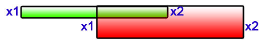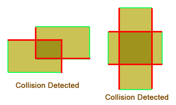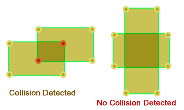 Perhaps the most obvious, but incorrect solution is to test if each of the vertices, or corners, of the rectangle is inside of the other rectangle. Since point-rectangle collision detection is fairly simple, this seems like a good idea. All we must do then is check if each point (x,y) is inside the bounds of the other rectangle. For example, if we label the sides of the rectangle as x1, x2, y1, and y2. Our solution would work somewhat like this: